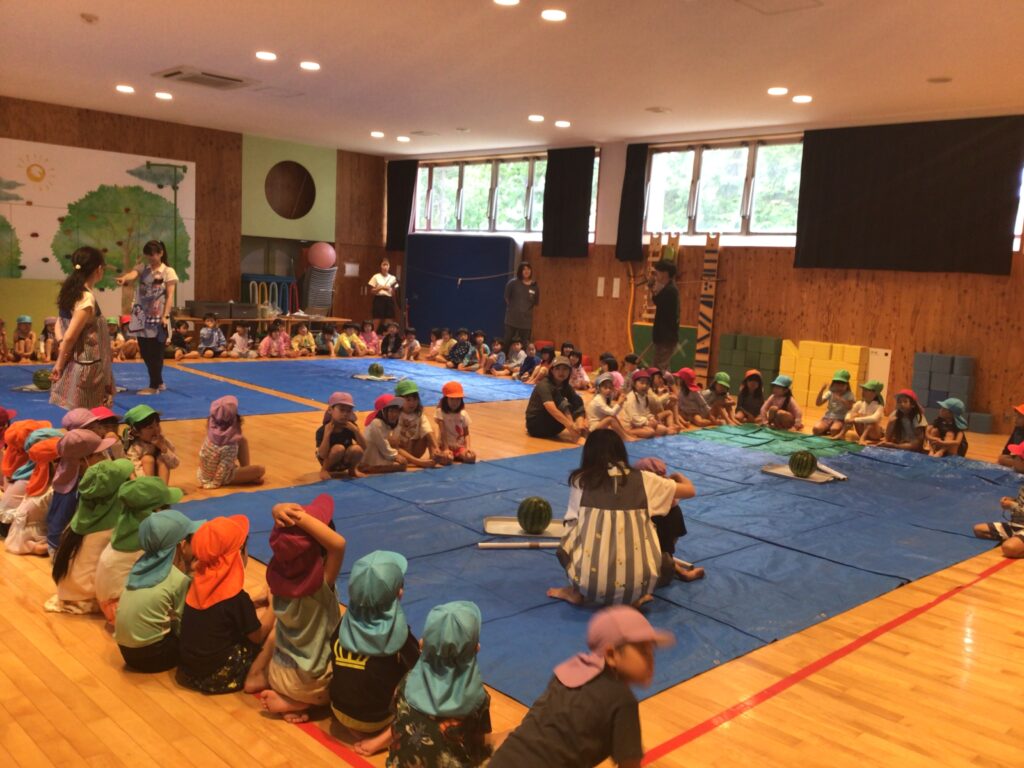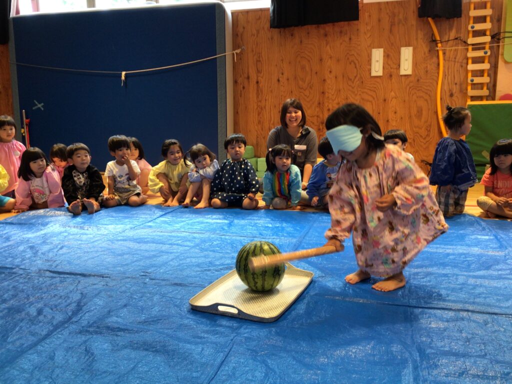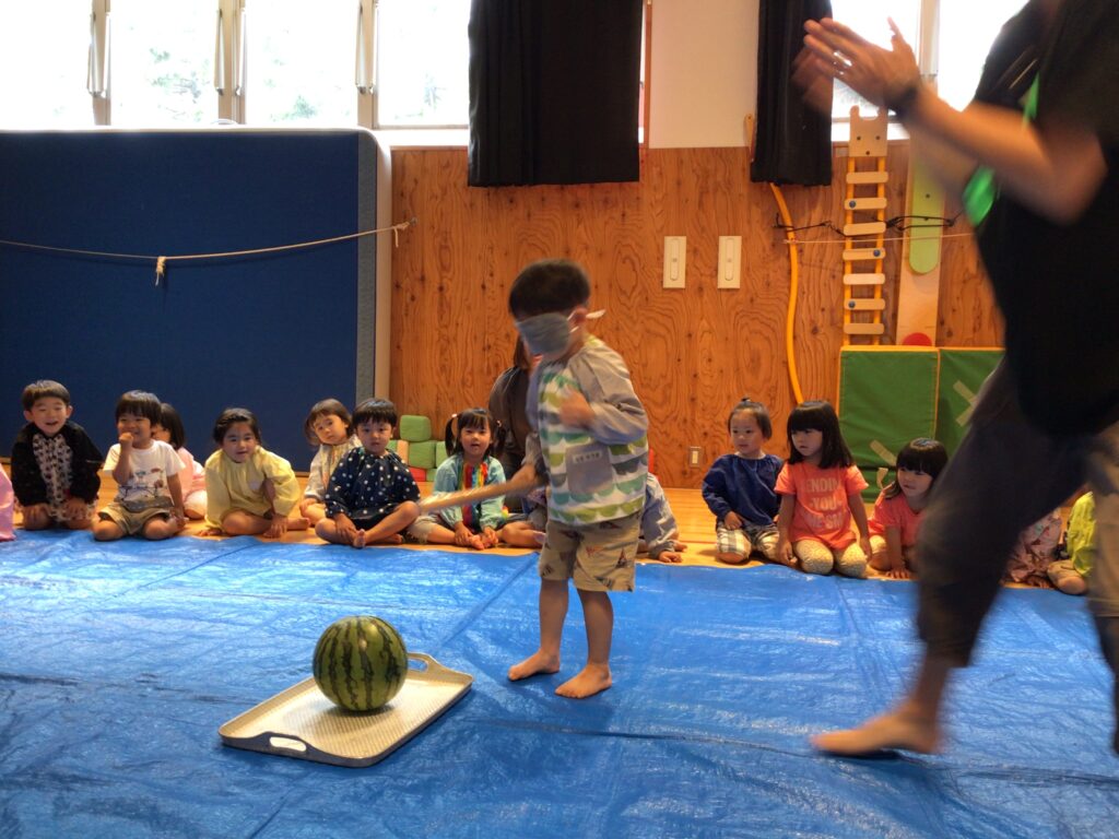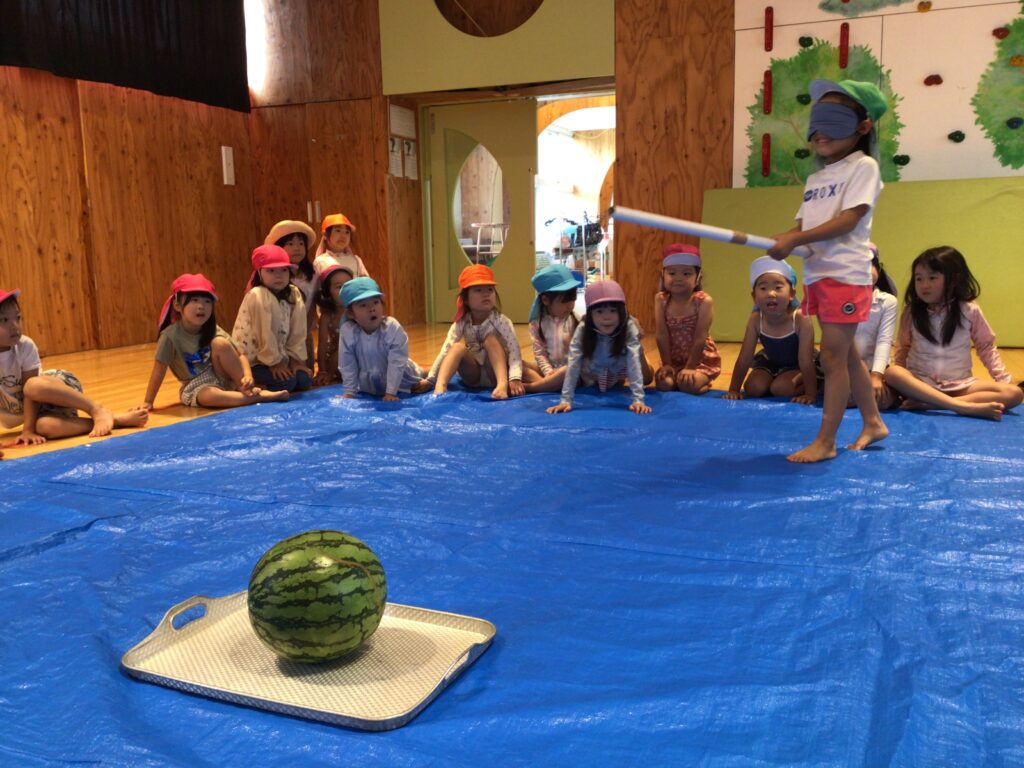 そして、夏の思い出作りとして、『すいか割り』を行いました!今回は、すいか割りを“サプライズ”としていた為、子どもたちからは「すいか割りいつー?」「はやくしたいな〜」というワクワクした気持ちが伝わる言葉で溢れ、高まる思いですいか割りをはじめることができました♪