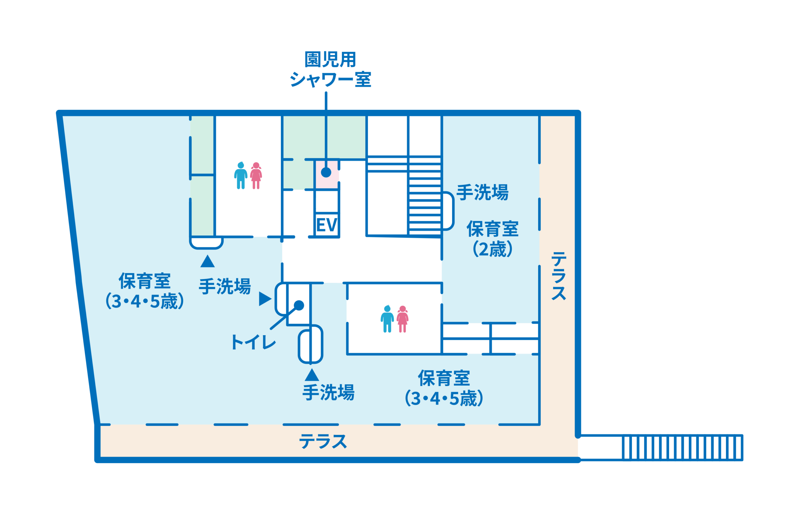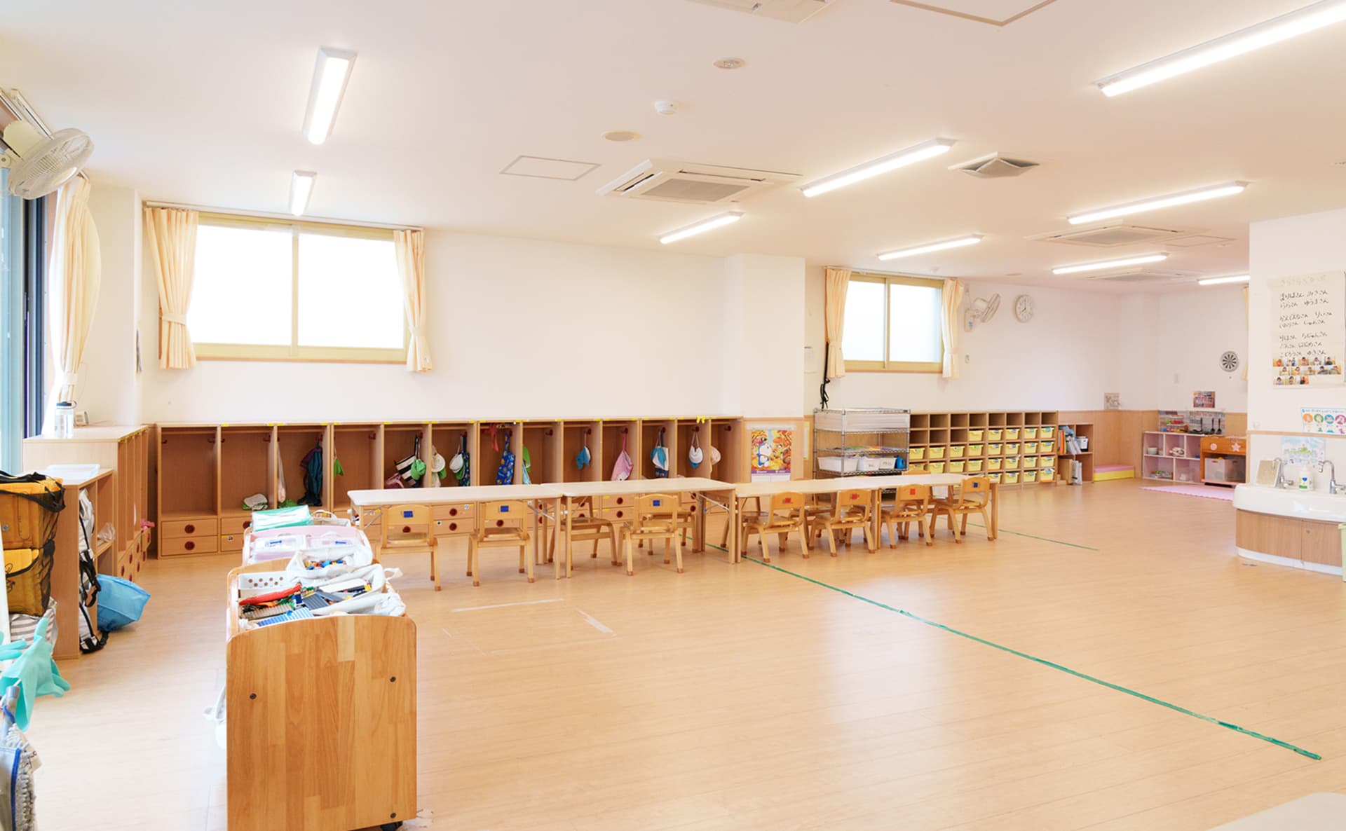 3~5歳児の幼児クラスは、仕切りの無い開放的な保育空間で、異年齢で過ごします。同じ興味を持つお友だちと自由にあそべる環境で、お互いのあそびを見て学んだり、自然とリードする姿や協力し合う姿がそれぞれの個性を伸ばしています。