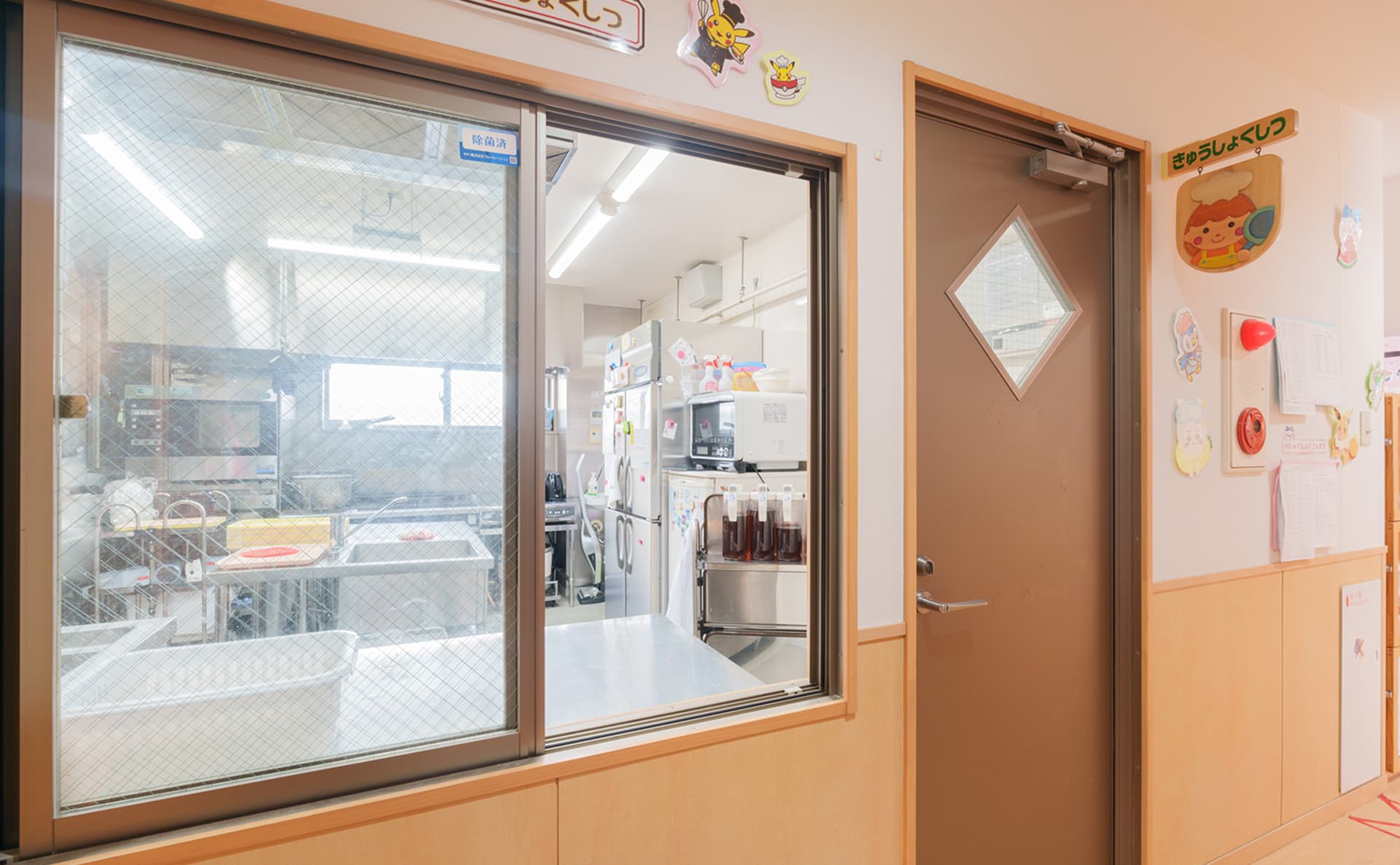 窓越しに調理の様子が見えるキッチン。「今日のごはん何かな?」と、子どもたちが毎日ワクワクしながら覗きにきます。