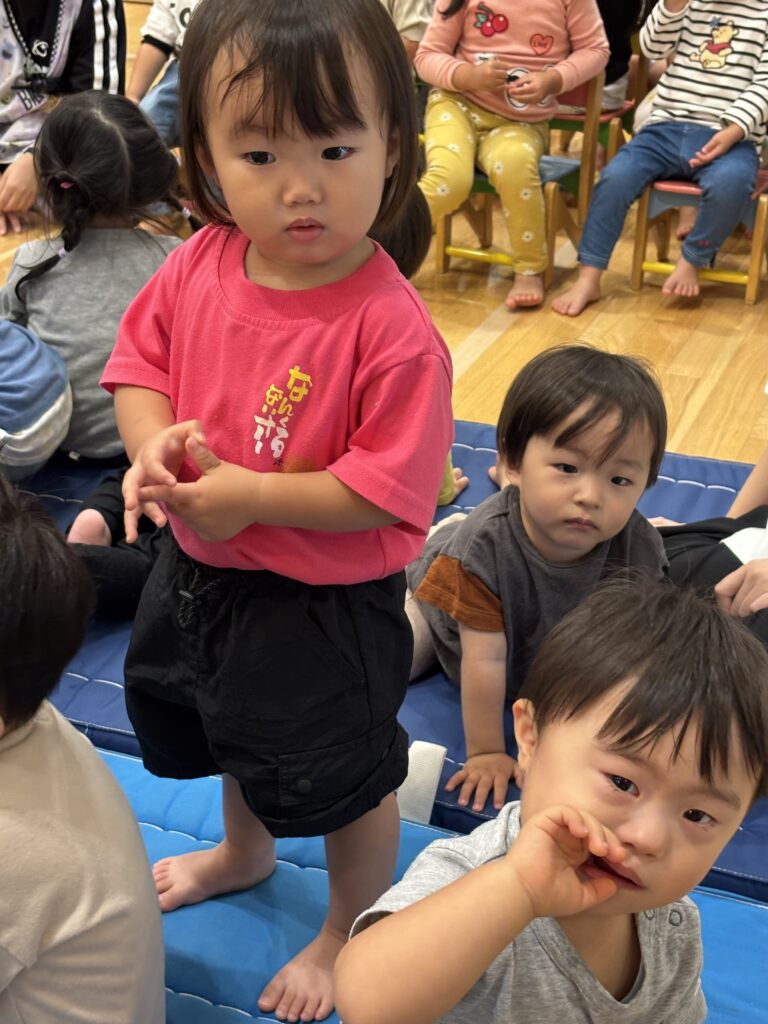 他のクラスのお友だちがもも組さんの歌声に聞き入っていました。